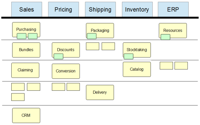 Für die Erstellung und Verwaltung von Anforderungen gibt es Instrumente (z. B. Hierarchical Backlog oder Story Maps), die eine ähnliche Zielsetzung auf fachlicher Ebene besitzen. Diese teilen ein System nach den fachlichen Bereichen auf und innerhalb dieser dann auf die entsprechenden Storys des jeweiligen Bereiches. So gewinnt man nicht nur einen Gesamtüberblick über das Produkt, sondern kann durch die Aufteilung auch einzelne Anforderungen und Fortschritte in Relation zum gesamten Produkt verfolgen. Dies können sehr mächtige Werkzeuge zur interdisziplinären Abstimmung sein, doch bei zu großen Produkten bzw. Kontexten kann es unübersichtlich werden. Von daher profitieren auch diese Werkzeuge von der Verkleinerung der Komponenten.