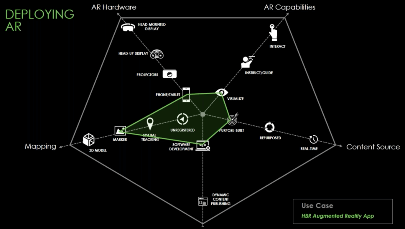 Michael Porter von der Harvard Business School schlägt für diesen Zweck ein Netzdiagramm zur dedizierten Planung von Mixed-Reality-Anwendungen vor: