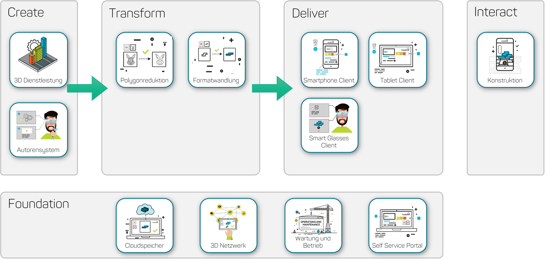Einem Share-economy-Ansatz folgend, profitiert jeder neue Kunde von den Entwicklung der vorhergegangen Projekte und jeder Bestandskunde von den Weiterentwicklungen zukünftiger. Unser 3D-Netzwerk erlaubt es uns, bereits bestehende Produkte anderer Anbieter im Rahmen von Vertriebspartnerschaften zu vermitteln. So können wir nicht nur als Anwendungsentwickler und -integratoren, sondern auch als “Einkaufsberater” unseren Kunden zur für sie passendsten Lösung verhelfen, ohne eigene Ressourcen einsetzen zu müssen. Wenn es jedoch darum geht, AR oder VR in bestehende Infrastrukturen zu integrieren oder benachbarte Technologien wie Blockchain, Artificial Intelligence/Machine Learning oder Big Data mit Mixed Reality zu noch nie dagewesen Anwendungsfällen zu kombinieren, können wir als wohl derzeit einziger Anbieter am Markt ein crossfunktionales Team aus allen notwendigen Rollen zusammenstellen.