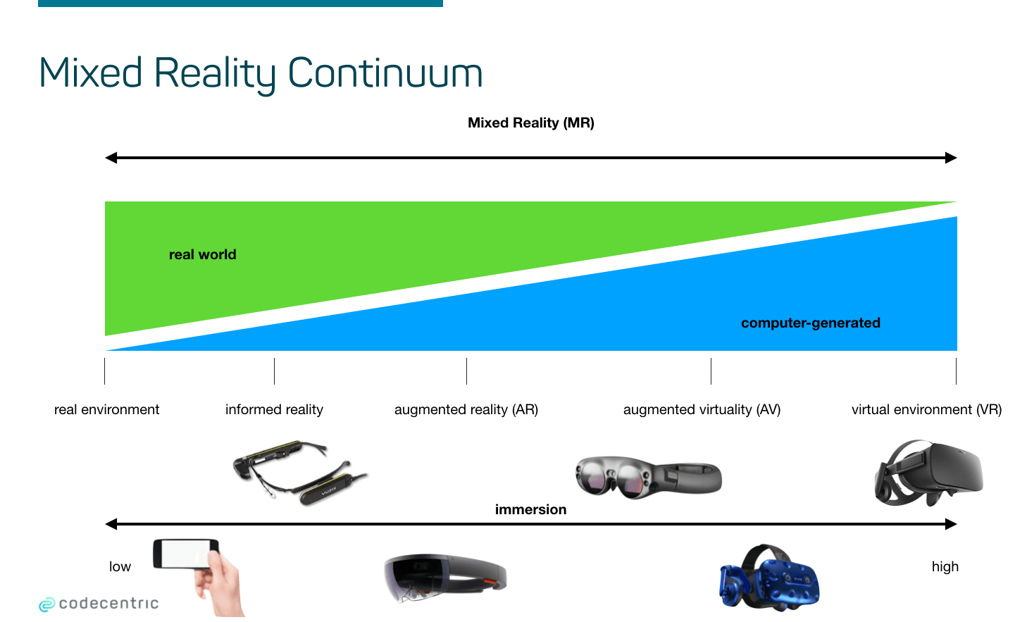 “Mixed Reality” ist ein von Microsoft geprägter Begriff, der die verschiedenen Technologien zusammenfasst, die digitale (= virtuelle) mit realen Inhalten mischen. Dabei kommt unterschiedliche Hardware zum Einsatz, vom Mobiltelefon bis zur Virtual-Reality-(VR-)Brille. Der Grad der “Immersion” – d. h. der Abschottung von der realen und des Eintauchens in eine virtuelle Welt – ist bei allen Geräten unterschiedlich und muss für den jeweiligen Anwendungsfall geeignet gewählt werden.