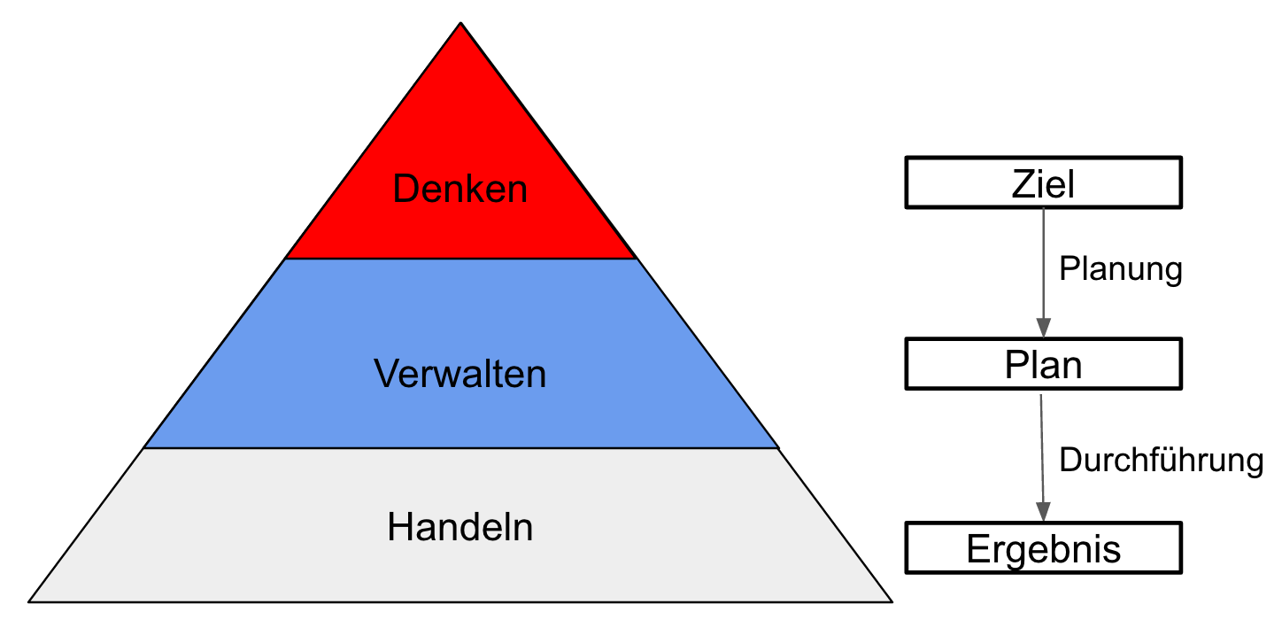Diese Pyramide gibt es in verschiedenen Varianten (in Form unterschiedlicher Organisationsstrukturen). Alle Varianten haben gemeinsam, dass der Ort der Entscheidung weit vom Ort des Handelns entfernt liegt. Es existiert also immer eine strikte Trennung von “Denken” und “Handeln”, von “Plan Erstellung” und “Plan Ausführung”. Planung ist der Prozess mit dem die Denkenden den Handelnden vorschreiben, wie sie ein Ergebnis erzielen sollen.