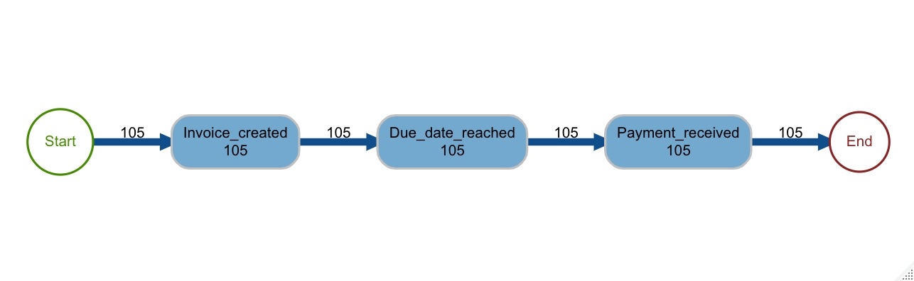 In Abbildung 3 können wir anhand des Prozessplans erkennen, dass der häufigste vorkommende Prozess aus drei Aktivitäten besteht. In 105 Fällen beginnt der Prozess mit der Rechnungsstellung. Bevor die Zahlung eingeht, wird die Zahlungsfrist überschritten.