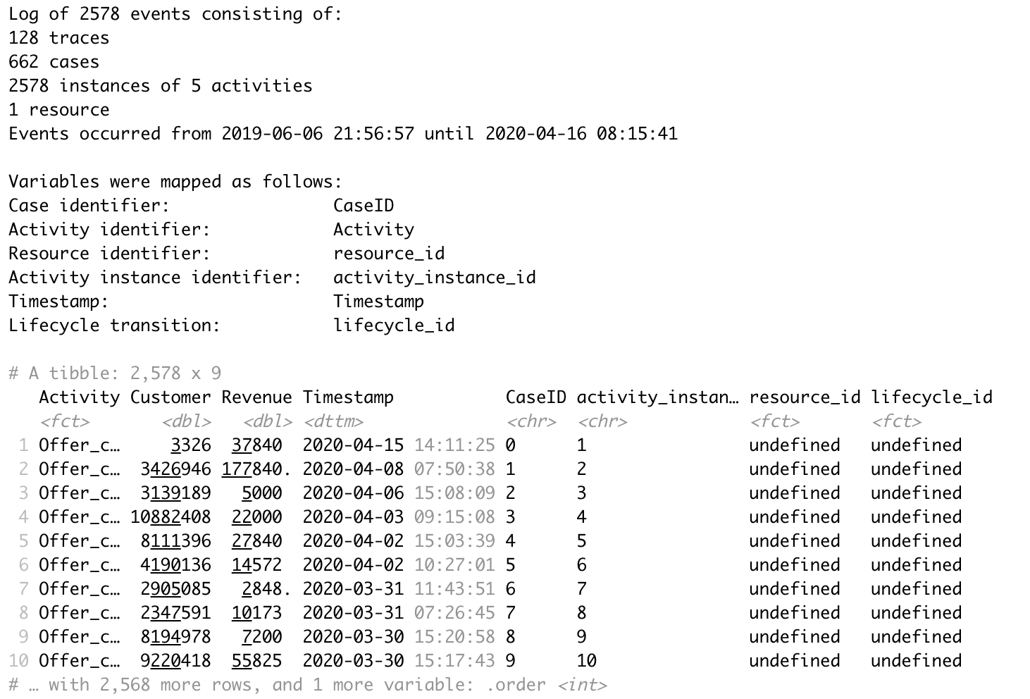 Der in Abbildung 2 wiedergegebene Output gibt uns Einblicke in das erzeugte Ereignisprotokoll. Anhand der 2.578 eingelesenen Zeilen hat bupaR 128 unterschiedliche Prozessvarianten und insgesamt 662 Fälle identifiziert. Durch die Zuordnung der Spalten erkennt bupaR die fünf Aktivitäten (Activity) des Datensatzes automatisch. In unserem Anwendungsfall haben wir uns auf den Zeitraum vom 06.06.2019 bis 16.04.2020 beschränkt. Darüber hinaus besteht das Ereignisprotokoll aus vier Spalten mehr als der eingelesene Datensatz. Die Aktivitätsinstanzkennung (activity_instance_id) ermöglicht zusammengehörende Aktivitäten zu verbinden. Dies ist insbesondere dann relevant, wenn verschiedene Stati je Aktivität angegeben werden. So würden beispielsweise die Aktivitäten „Rechnung erstellt – Start“ und „Rechnung erstellt – Beendet“, die sich auf die gleiche Rechnung beziehen, eine identische Kennung erhalten. In unserem Anwendungsfall berücksichtigen wir keine Stati, so dass jede Aktivität eine eigene Kennung erhält. Die Ressourcenkennung (resource-id) bleibt bei der Verwendung eines einfachen Ereignisprotokoll undefiniert, da keine Zuordnung von Ressourcen in der Funktion erfolgt. Eine Ressource könnte beispielsweise ein Mitarbeiter, ein Standort o. ä. sein. Die Lebenszykluskennung (lifecycle_id) bezieht sich ebenfalls auf verschiedene Stati der Aktivitäten und bleibt somit in unserem Beispiel undefiniert. Anhand der Zeitangaben wird die Reihenfolge (order) von Aktivitäten in bupaR automatisch ermittelt.