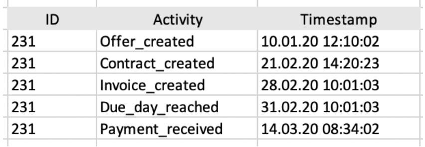Die Ausführung der Aktivitäten zu bestimmten Zeitpunkten führt zu Ereignissen (z. B. Rechnung erstellt am 01.02.2020 um 12:01:20). Diese Ereignisse lassen sich einem eindeutigen Merkmal des Projekts zuordnen (z. B. Rechnung erstellt am 01.02.2020 um 12:01:20 für das Projekt „Process Mining“). Die daraus entstehenden Ereignisdaten sind demnach ein Tupel