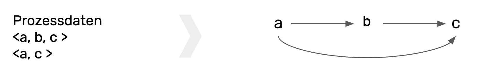 Beispiel: Ein Prozess wird mit der Symbolik <> von einem anderen Prozess abgegrenzt. Die innerhalb eines Prozesses aufeinanderfolgenden Schritte (hier: a, b und c) sind durch Kommata getrennt. Wenn b auf a folgt, a aber nie auf b, dann wird angenommen, dass eine kausale Abhängigkeit zwischen b und a besteht. Die erkannten Muster werden üblicherweise mit einem Pfeil dargestellt.