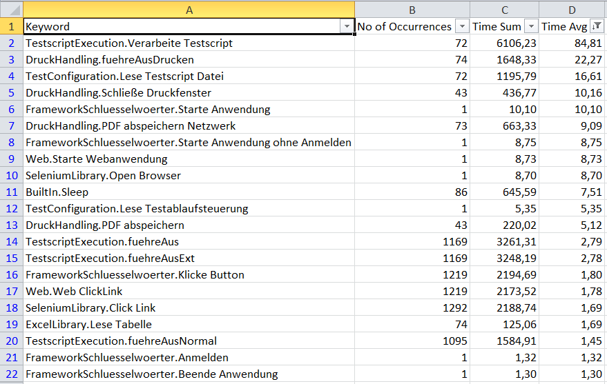 Das Script erzeugt eine Ausgabedatei, die in aller Regel mit einem Doppelklick in MS Excel geöffnet werden kann. Neben dem (vollqualifizierten) Keyword-Bezeichner sind die Anzahl der Aufrufe, die Gesamtausführungszeit und die durchschnittliche Ausführungszeit aufgeführt.
