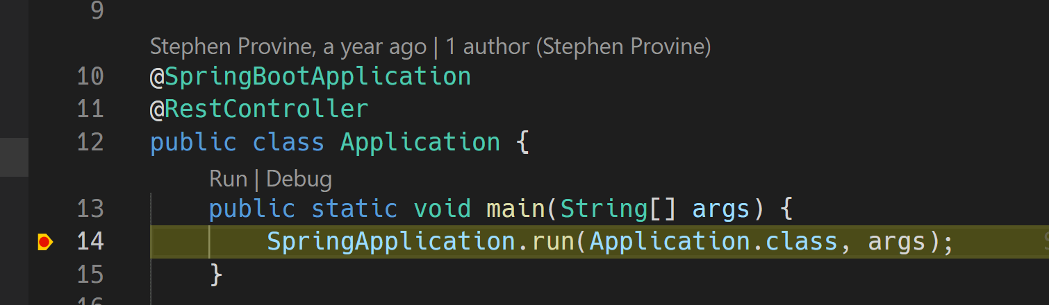 Um das Debugging zu testen, setzt du in Application.Java Zeile 14 einen Breakpoint.