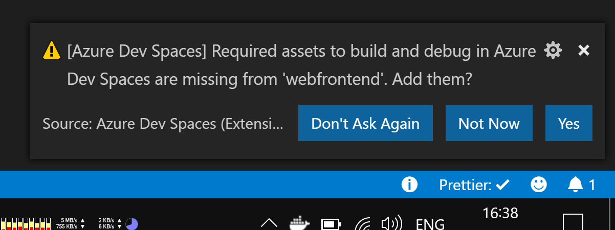 Beim ersten Start sollte Azure Dev Spaces erkennen, dass diverse Dinge in dem Projekt fehlen und vorschlagen, diese zu ergänzen. Achtung, dieser Vorschlag erscheint rechts unten beim Start und kann schnell mal übersehen werden. In dem Fall VSC neu starten.