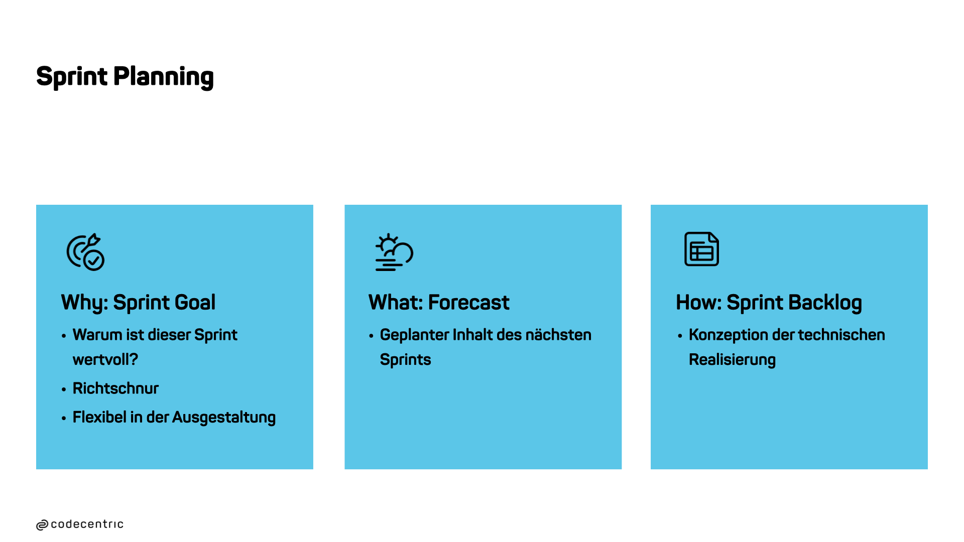 Im Scrum Guide 2020 werden diese zwei Themen noch um ein Drittes ergänzt: das “Warum”. Das neue dritte Thema “Warum” ergänzt also die beiden bisherigen Themen “Was” und “Wie”. Es beantwortet die Frage: “Warum ist dieser Sprint überhaupt wertvoll?” oder “Wie können wir den Wert unseres Produktes am besten steigern?”