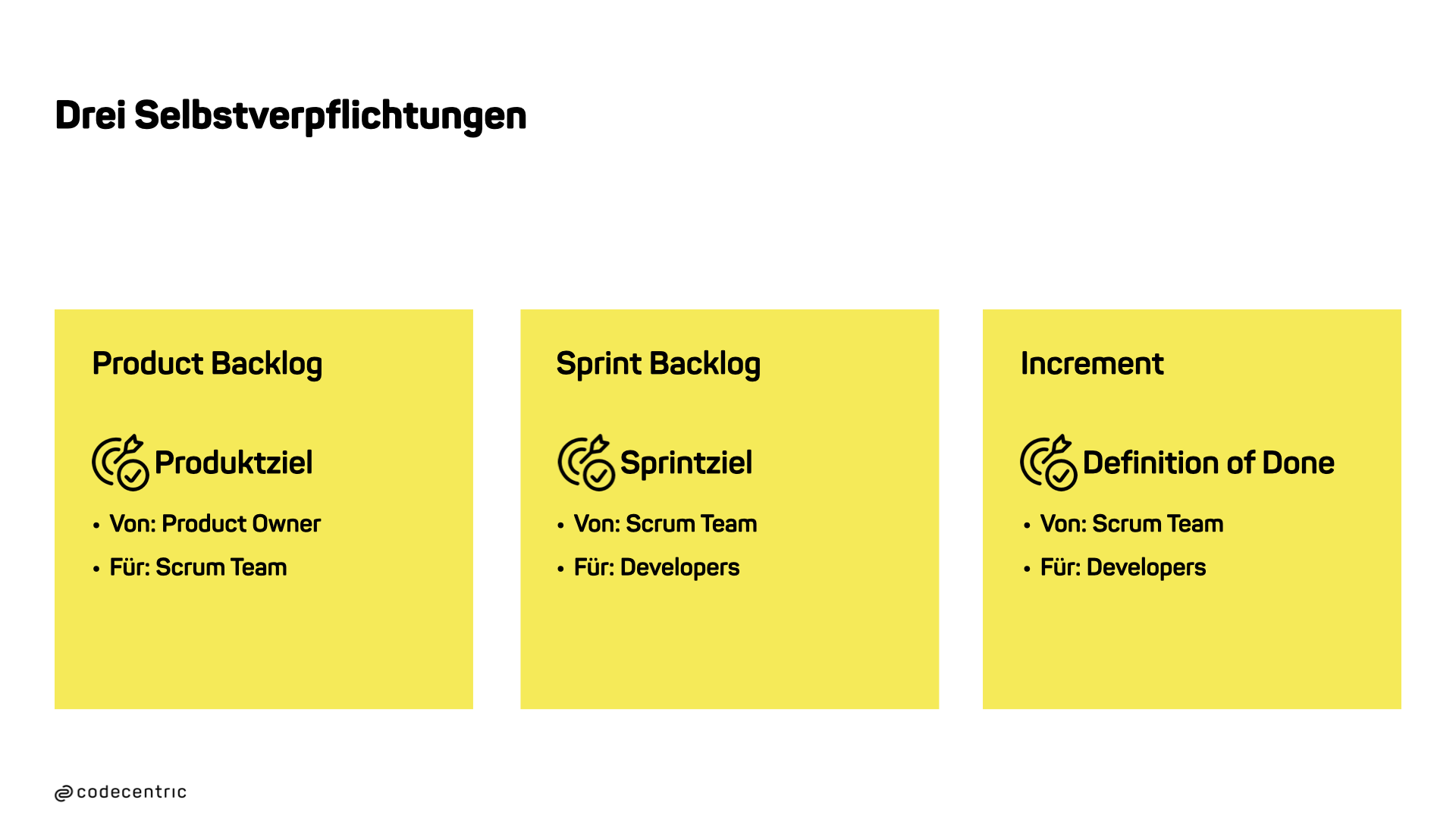 Mit der Formulierung des Produktziels ist es jetzt möglich, den drei Artefakten drei sogenannte Selbstverpflichtungen (oder auf Englisch commitments) zuzuordnen. Diese Selbstverpflichtungen schützen vor schwammigen und beliebigen Artefakten. Sie fördern Fokus und Transparenz und machen Fortschritt sichtbar und messbar.
