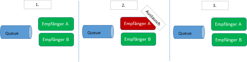 Da die Nachricht bei einer Queue nur an einen Empfänger zugestellt wird, auch wenn mehrere registriert sind, lässt sich hierüber ein automatisches Load-Balancing erreichen, ohne Gefahr zu laufen, Nachrichten mehrfach zu verarbeiten. Wir können beliebig viele Empfänger registrieren, jede Nachricht wird nur exakt einmal verarbeitet, und wir benötigen keinen zusätzlichen Load-Balancer mit großen Port-Ranges und separater Konfiguration. Das geht sogar so weit, dass ohne zusätzlichen Aufwand ein Load-Balancing zwischen mehreren Servern und zwischen jeder Komponente erreicht wird. Das bedeutet auch, dass wir extrem einfach in die Breite skalieren können. Ob nun 2, 20 oder 200 Empfänger die Nachrichten verarbeiten macht aus Transportsicht keinen Unterschied. Dies ermöglicht es auch, einzelne Empfänger unterbrechungsfrei auszutauschen (z.B. beim Deployment), da während der Offline-Zeit ein anderer Empfänger die Nachrichten verarbeitet: