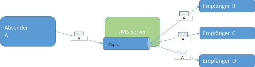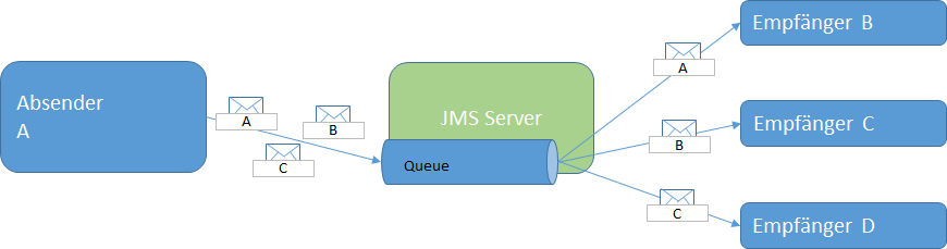 Queue – Mehrere Empfänger registrieren sich bei dieser Queue. Jede Nachricht wird jedoch nur genau einem Empfänger zugestellt. Ist kein Empfänger registriert, verbleibt die Nachricht solange in der Queue, bis sie abgeholt wird.