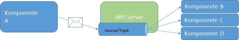 Im Prinzip laufen beim Messaging alle Nachrichten über „Queues“ oder „Topics“. Eine Komponente, die eine Nachricht versenden möchte, legt diese in einer Queue oder einem Topic ab, wo sie von einem Empfänger entgegengenommen werden kann: