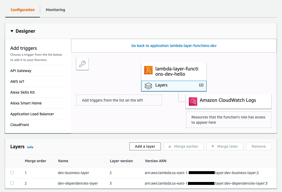 1functions: 2 hello: 3 handler: src/app/handler.hello 4 layers: # layer refs 5 - ... arn...