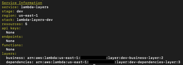 Wenn wir nun „sls deploy“ im Layers-Ordner ausführen, werden unsere Layer nach AWS deployed. Die Ausgabe sollte wie folgt aussehen: