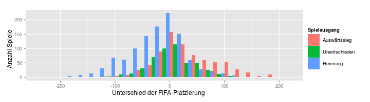 Eine (hoffentlich guter) Indikator für die relative Stärke der Kontrahenten bei Fußball-Länderspielen ist die FIFA-Weltrangliste. Die Ranglisten werden monatlich veröffentlicht. Auf der FIFA-Homepage können alle vergangenen Ranglisten bis ins Jahr 1992 eingesehen werden. Mit einem kleinen R-Skript können nun die FIFA-Platzierung der Kontrahenten zum Zeitpunkt des Spiels zu ermittelt werden. Dabei leistet mapply gute Dienste. Im folgenden Histogramm sieht man die Verteilung von Siegen und Niederlagen abhängig vom Unterschied der FIFA-Platzierung der beiden Kontrahenten: