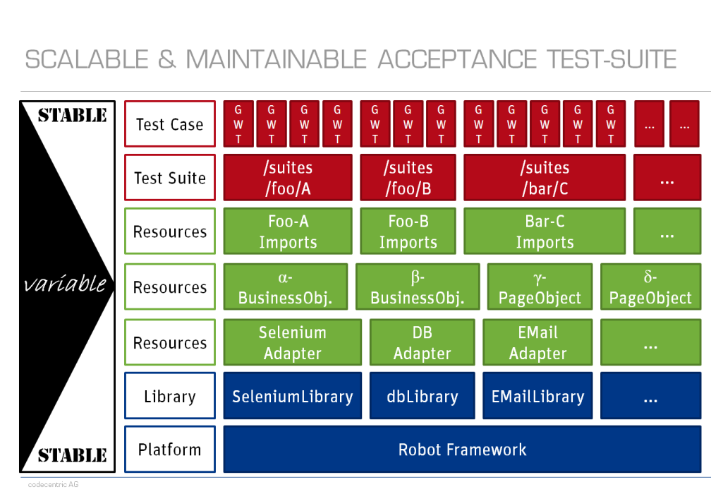 Stabil sind z.B. das Testframework selbst und die zugehörigen Libraries und Plug-Ins. Diese wird man nicht mal eben austauschen sondern nach Möglichkeit konstant halten. Ebenso konstant sollten die Testfälle selbst bleiben, wenn es keine Geschäftsgrundlage gibt, die Tests zu ändern. Was allerdings problemlos möglich sein sollte: neue Tests unabhängig von den anderen hinzufügen. Wo sind dann die variablen Teile der Test-Suite, wenn sowohl die Tests (gedanklich ganz oben), als auch die Plattform (gedanklich ganz unten) stabil sein sollen. Die nachfolgende Grafik soll dies verdeutlichen und beschreibt den Aufbau einer wartbaren und skalierenden Test-Suite. Die einzelnen Schichten werden unterhalb der Grafik im Detail beschrieben, ganz grob lässt sich die Frage nach den variablen Teilen ganz einfach beantworten: Wenn ich ein System habe, dass an zwei Enden Stabil sein soll, insgesamt aber flexibel, dann müssen die variablen Anteile natürlich in der Mitte sitzen.