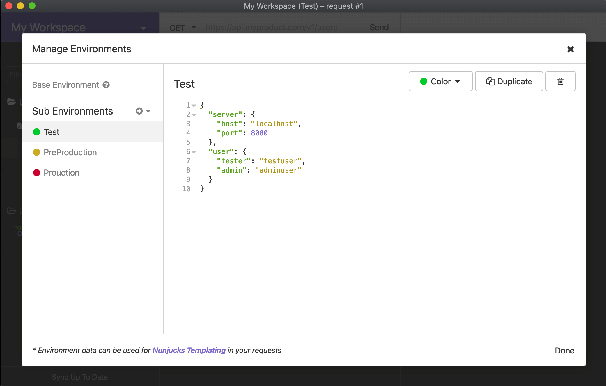 Wie in anderen Applikationen gibt es auch in Insomnia Environment Variablen. Der Vorteil in Insomnia ist, dass man diese als JSON-Struktur anlegt. Dies bietet die Freiheit, seine Variablen nach Belieben zu strukturieren und auch tiefere Strukturen abzubilden. Über eine Tastenkombination können diese Variablen dann direkt in den gewünschten Feldern angezeigt und eingefügt werden.