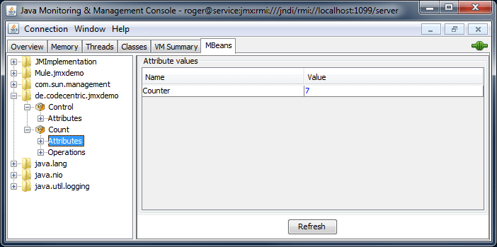 Wer sich das Bild genauer ansieht, entdeckt unten auch die MBean „de.codecentric.jmxdemo“. Sie stammt nicht von Mule, hier wird etwas aus der eigenen Applikation zugänglich gemacht.