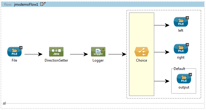 1<flow name="jmxdemoFlow1" doc:name="jmxdemoFlow1"> 2 <file:inbound-endpoint path="C:\MuleDemo\input" responseTimeout="10000" 3 doc:name="File" 4 moveToDirectory="C:\MuleDemo\processed" /> 5 <custom-transformer class="de.codecentric.jmxdemo.DirectionSetter" 6 doc:name="DirectionSetter"> 7 <spring:property name="controller" ref="Control" /> 8 </custom-transformer> 9 <logger level="ERROR" doc:name="Logger" 10 message="#['Richtung: ' + message.outboundProperties['direction']]"> 11 </logger> 12 <choice doc:name="Choice"> 13 <when expression="#[message.outboundProperties['direction']=='left']"> 14 <file:outbound-endpoint path="C:\MuleDemo\left" responseTimeout="10000" 15 doc:name="left" /> 16 </when> 17 <when expression="#[message.outboundProperties['direction']=='right']"> 18 <file:outbound-endpoint path="C:\MuleDemo\right" responseTimeout="10000" 19 doc:name="right" /> 20 </when> 21 <otherwise> 22 <file:outbound-endpoint path="C:\MuleDemo\output" responseTimeout="10000" 23 doc:name="output" /> 24 </otherwise> 25 </choice> 26</flow>