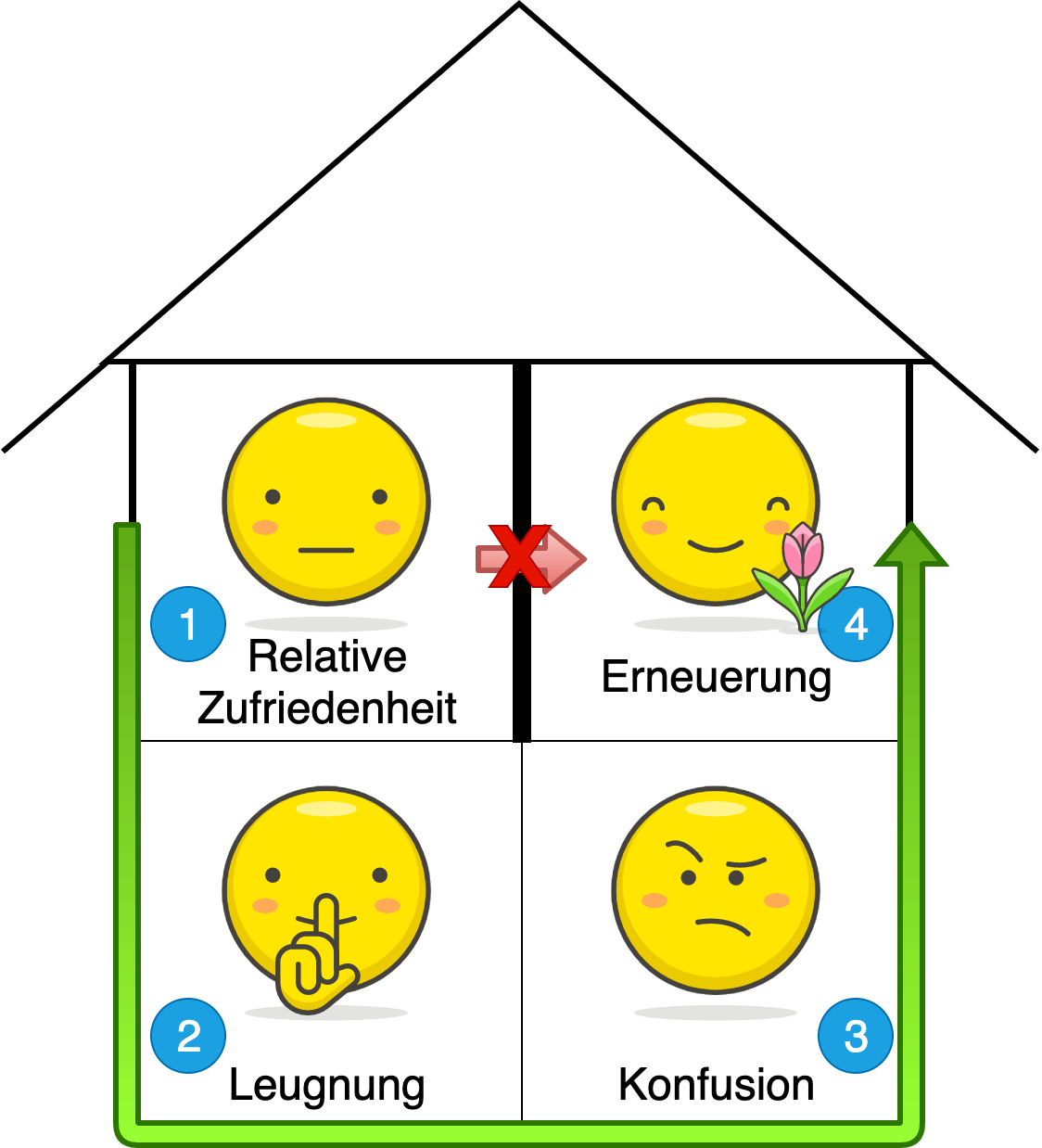 Claes Janssen beschreibt dies mit seinem nebenstehendem „4 Zimmer Haus“ , in dem der Weg aus der Komfortzone und routinierten Abläufen (1) zwangsweise über die unten liegenden Zimmer der Leugnung (Gefühl der Veränderung und Verunsicherung) und Konfusion (Kontrollverlust und Unsicherheit) führt. Es kommt sogar vor, dass zwischen der Leugnung (2) und der Konfusion (3) oszilliert wird. Dadurch wird der Wunsch zu alten Mustern (1) zurückzukehren verstärkt.