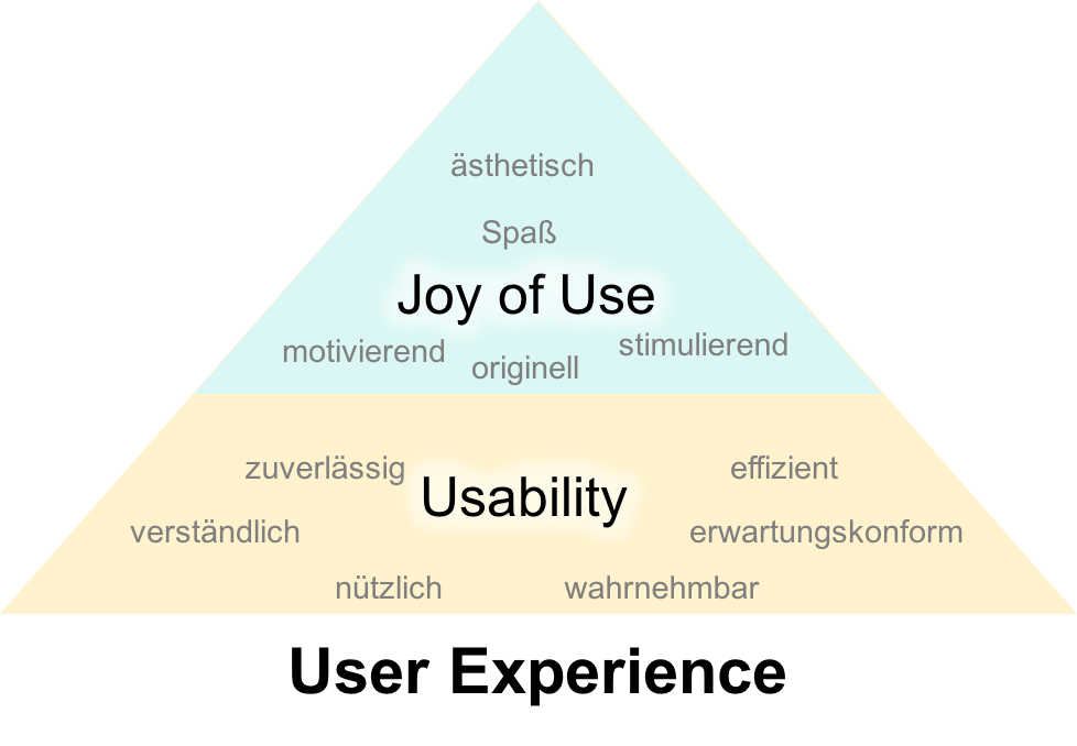 Mir ist an dieser Stelle aber auch die Gewichtung dieser Kriterien wichtig. Gerade wenn wir Benutzerschnittstellen gestalten, die im Geschäftsumfeld eingesetzt werden, ist die Usability die Grundlage. Solange diese Grundlagen nicht stimmen, sollten wir auch keine Zeit investieren den Joy of Use unserer Anwendung zu verbessern. Im Gegenteil: Eine Investition in den Joy of Use unseres Interfaces bei einer Software, die nicht zuverlässig funktioniert, würde uns von unseren Anwendern sogar negativ ausgelegt werden.