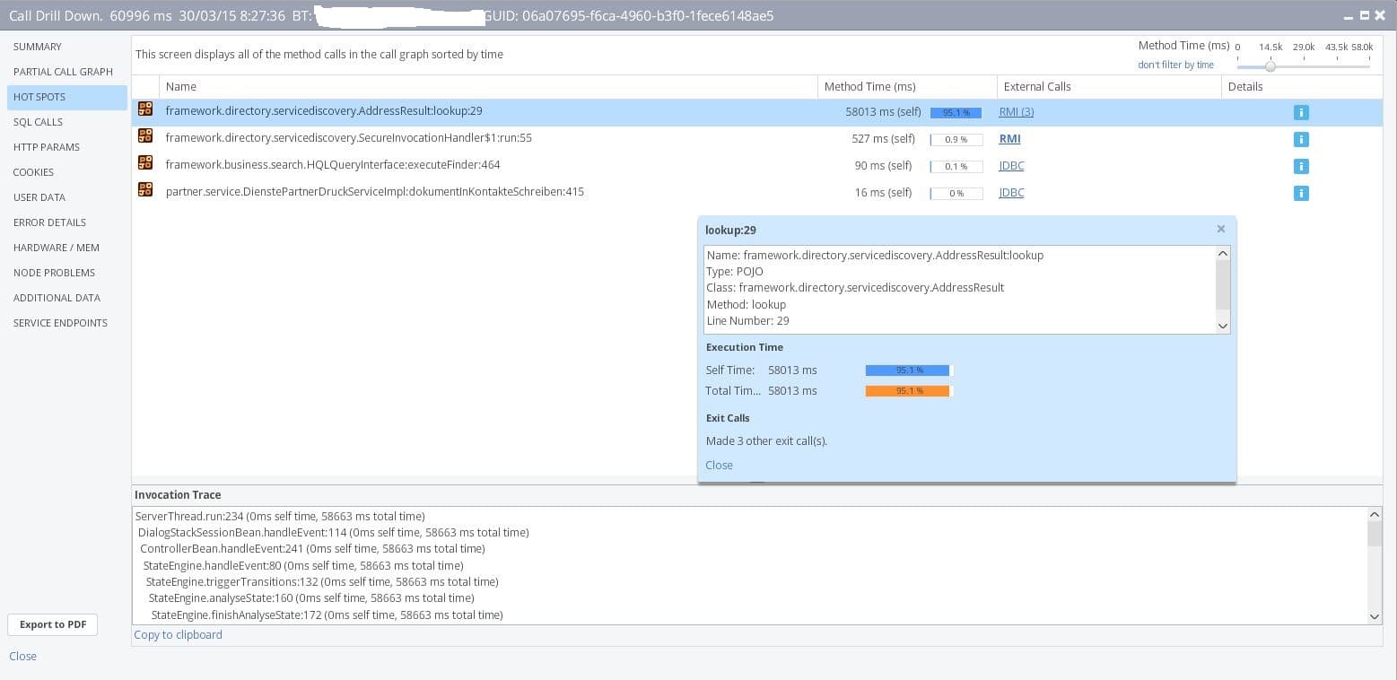 Eine der wichtigsten Eigenschaften von Business Transactions – und von APM-Werkzeugen insgesamt – ist ihre Unterstützung bei der Identifikation der Ursachen von Performance-Problemen. Wenn Nutzer einer Anwendung z.B. lange Antwortzeiten bei bestimmten ihrer Aktionen bemerken, ist es ohne APM häufig so, dass man bzgl. der Ursache im Dunkeln tappt und eigentlich nur raten kann. Kennt man dagegen die Business Transaction, die zu der betreffenden Nutzer-Aktion gehört, hat man einen direkten Ansatz, das Problem zu analysieren. Sehr oft kann man in wenigen Schritten zu der Java-Methode oder dem Aufruf eines entfernten Systems (Datenbank, Webservice etc.) gelangen, die die Performance-Schwierigkeiten verursacht.