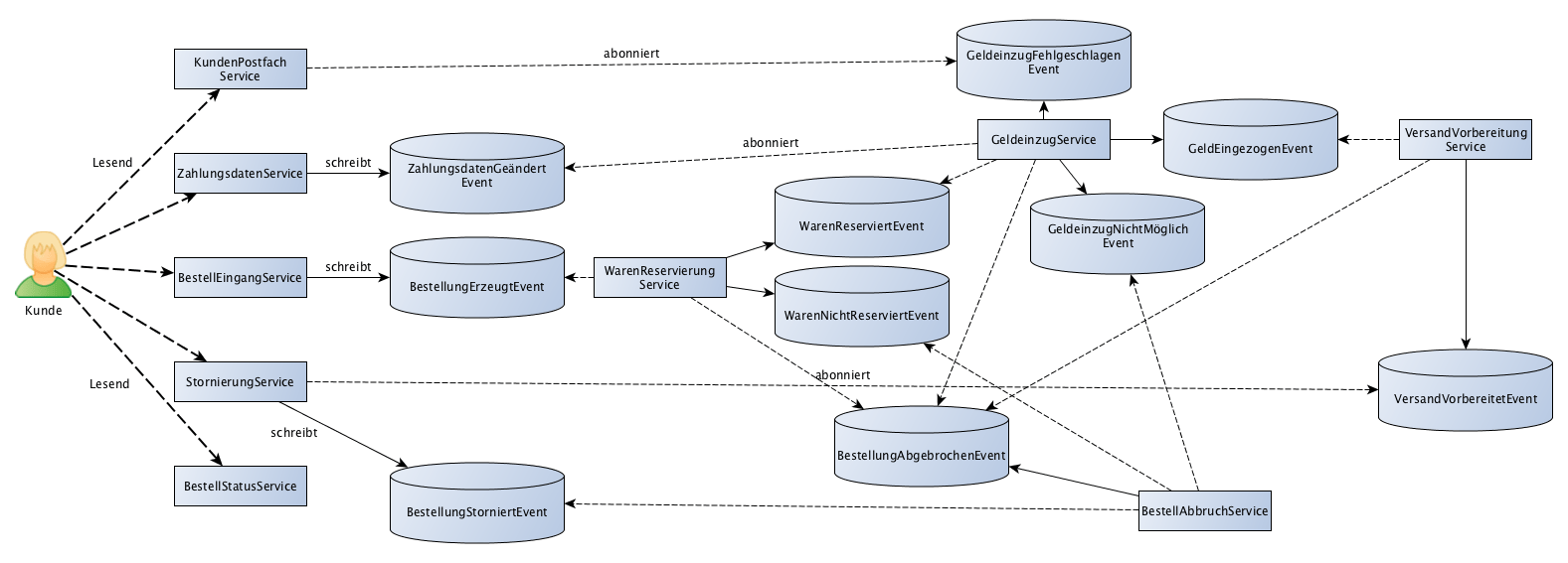 - StornierungService. Horcht auf VersandVorbereitetEvents, um eine Stornierung direkt zu verhindern, wenn der Versand einer Bestellung bereits vorbereitet wurde. Hat eine synchrone Schnittstelle für das Auslösen einer Stornierung, die bei erlaubter Stornierung ein BestellungStorniertEvent schreibt.