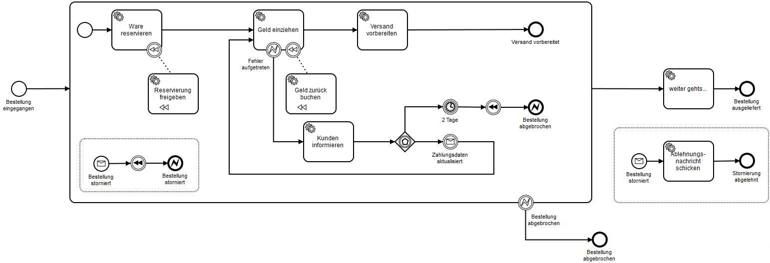 - BestellAbbruchService. Horcht auf BestellungStorniertEvents, WarenNichtReserviertEvents und GeldeinzugNichtMöglichEvents und feuert jeweils ein BestellungAbgebrochenEvent. Denkbar ist hier auch eine synchrone Schnittstelle für Sachbearbeiter.