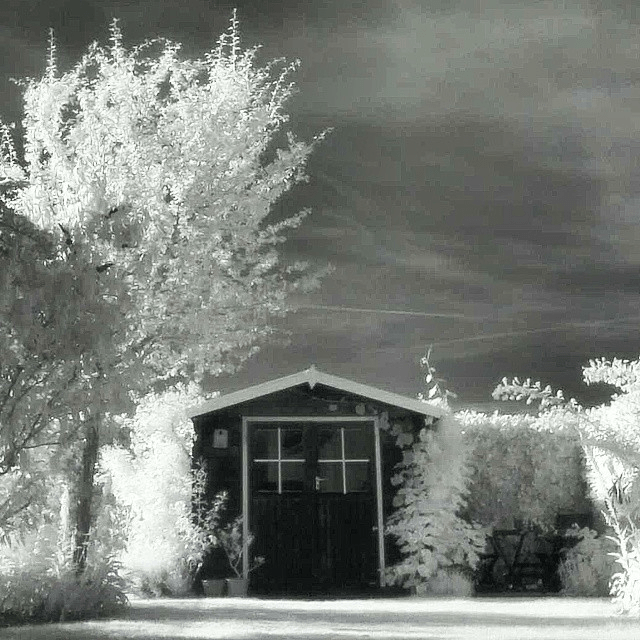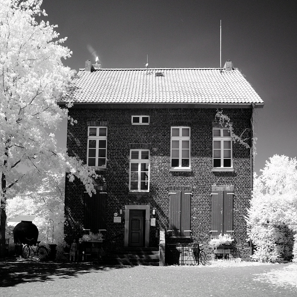 Hier ist nun mein erstes eigenes Infrarotfoto, etwa dreißig Jahre, nachdem ich das U2-Cover gesehen hatte. Für ein Schloss und eine Band hat es nicht gereicht, so musste der Garten herhalten. Als Filter habe ich den Negativstreifen genommen.