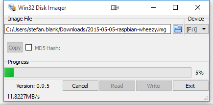 Das entpackte Image wird mit dem Win32 Disk Imager auf die microSD gespielt.