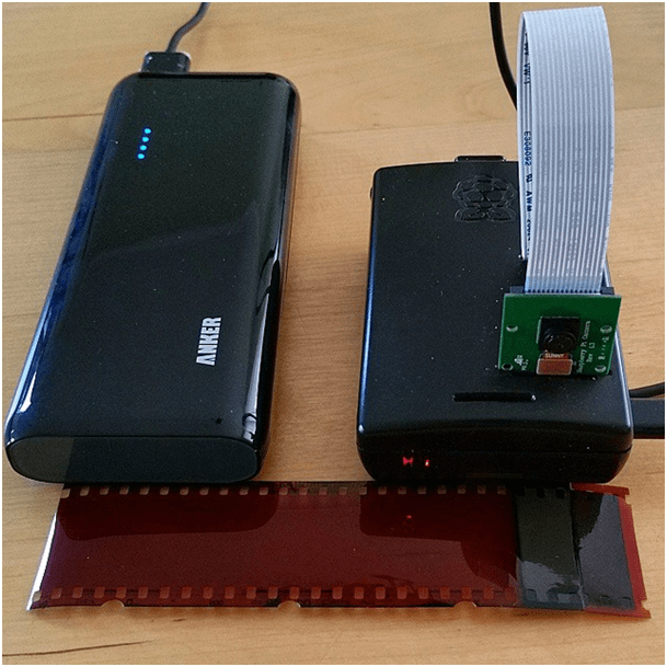 Für die Umsetzung brauchte ich eine mobile Stromversorgung in Form einer Powerbank, einen Wireless-LAN-Adapter, um den Pi 2 per Handy fernsteuern zu können und einen leeren Negativstreifen, der als Filter dienen sollte. Das Ganze sah dann so aus: