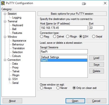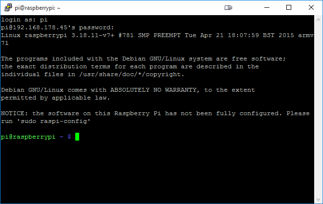 Nach dem Eröffnen der Verbindung muss ich mich mit dem Standard-Benutzer pi und dem Standard-Passwort raspberry einloggen.