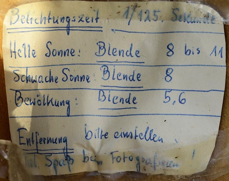 Diese hatte noch keinen Belichtungsmesser und daher gab mir mein Vater Tipps, welche Blende man bei welchen Lichtverhältnissen einstellen sollte. Meiner Mutter hatte er schon eine kleine Anweisung in die Schutzkappe geklebt.