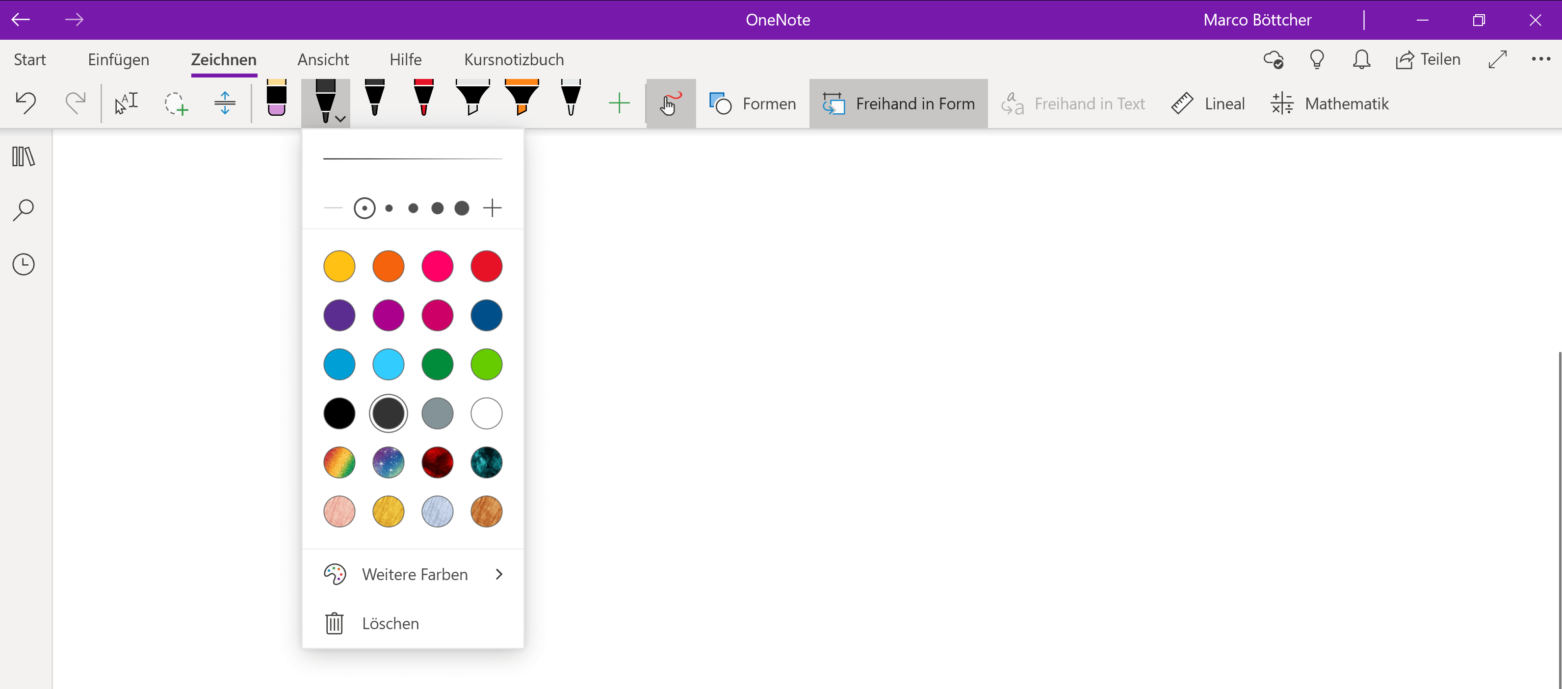 OneNote unterstützt nur drei verschiedene Pinseltypen. Diese können lediglich mit ausgewählten Farben und einer Stärke konfiguriert werden. Es ist nicht möglich, etwas Gezeichnetes per Farbeimer auszumalen. Perspektivisches oder gespiegeltes Zeichnen ist ebenfalls nicht vorhanden. Ohne Smoothing wird es nicht einfach, runde Formen zu zeichnen. Einfache Formen wie Rechtecke, Kreise und Ovale werden allerdings unterstützt, sogar mit einer semi-automatischen Erkennung.
